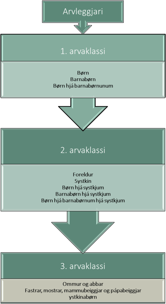 Familjan nevnd í 1. arvaflokki hevur fyrsta rætt til arvin. Um eingin er í 1. arvaflokki, fer arvurin víðari til 2. arvaflokk. Um eingin er í 2. arvaflokki, fer arvurin víðari til 3. arvaflokk. Er heldur eingin í 3. arvaflokki, fellur arvurin til landskassan.